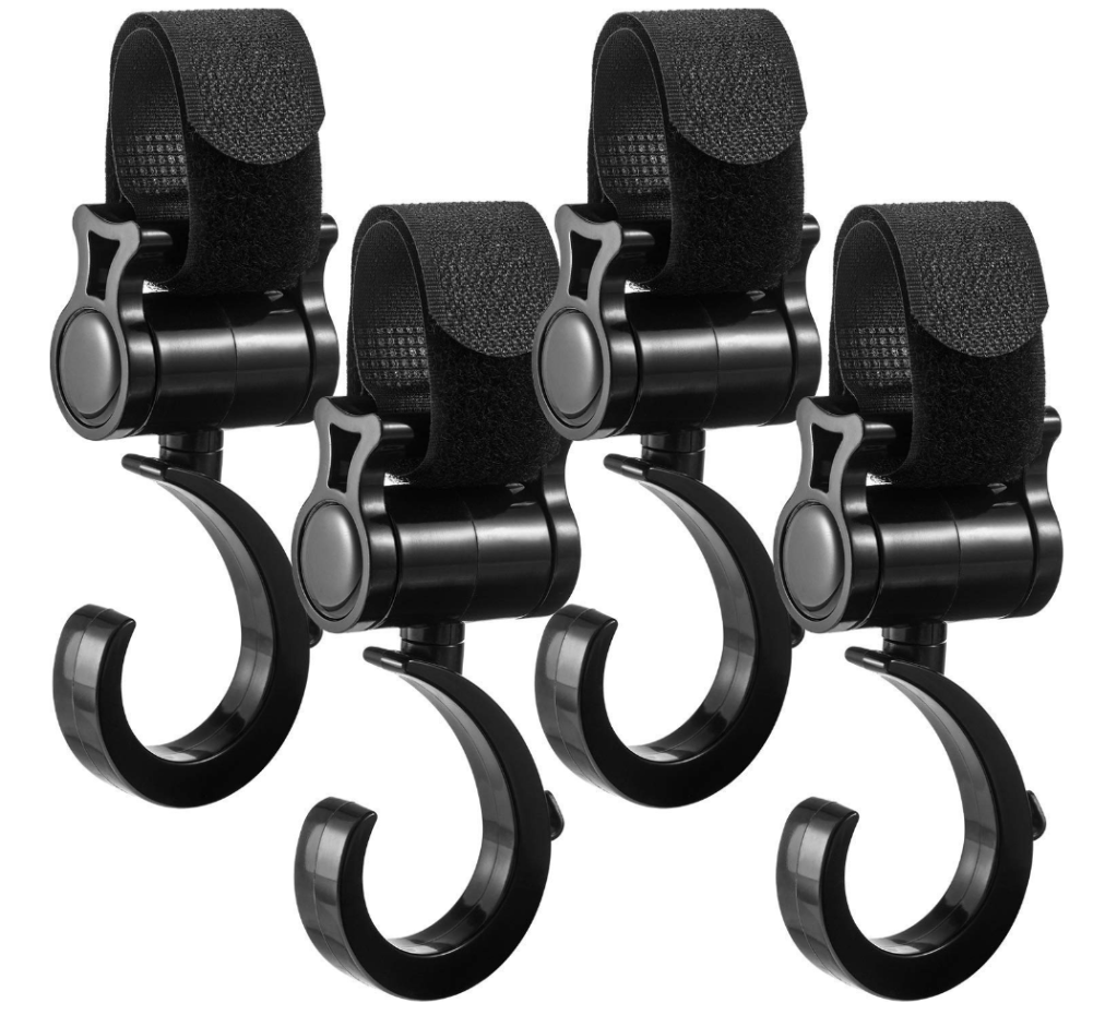 Stroller Hooks– I can’t live without my stroller hooks. If you don’t have these, you should. I love them, especially when traveling. I use them to hold all the things that I stick on carabiner clips (Toddler drink cup, snack cups, travel pillow, garbage bags, small backpack, a purse) and make it easy to go “hands free” quickly, like when you can’t find your boarding pass and need to check every pocket. It also makes the stroller do all the work. These rotate, so when my son gets out of his stroller, I just flip them around and hang all the bags to the front so the stroller doesn’t tip.
