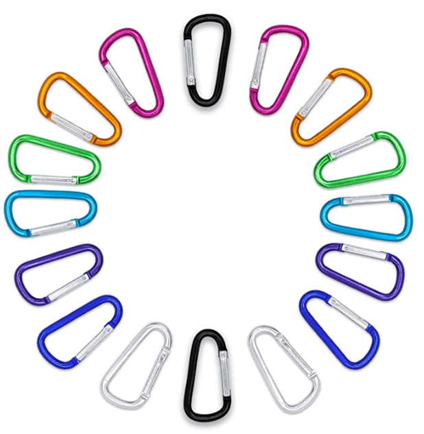 Carabiner clips- I bring these everywhere. I hang our son’s water bottle, snack cups, small bags for garbage, his travel blanket, his travel pillow, etc. I also use them to attach all that stuff to my back pack when jumping plane to plane, and to hang stuff from the stroller in between flights. Size will depend on what you want to hang, and color is personal preference.